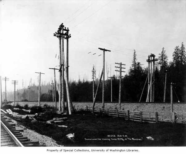 Old photograph of Transmission lines crossing NP tracks at The Meadows.