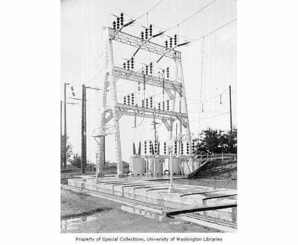 Old photograph of transmission bus at North substation with 165kv oil circuit breakers 1924.