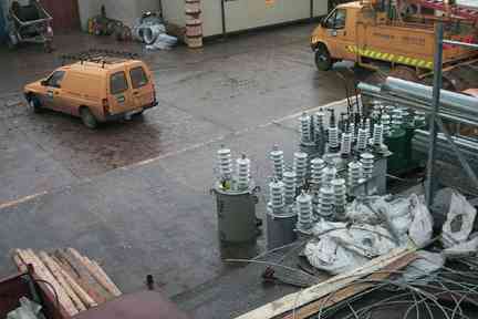 When my parents and brother and I visited Ireland in April of 2001, we followed up on a rumor I'd heard of an insulator cache at an electric company yard in Killarney. Sure enough, we found it! The offices were closed that day, but we found a bucket that provided enough elevation to allow us to shoot some pictures... [IFONA] |