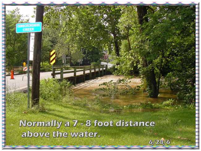 This is the Conococheague (kon-o-ko-jig) creek as of 6/28/6. The water is currently at 7-8ft. It would need rise probably 15-20 MORE before it could get to my basement. The stream runs about 400 feet in back of my house - but, thankfully, although it is at record height, it would still probably need go up another 15-20 feet to get to my basement as my house sits on a hill. I live about 1/2 mile from where this pic was taken. The Western MD runs just behind the brick building you see in the background - Hemingray 42's, 45's, CD 152 Brookfield's, plastic, and a sparse CREB 145 here and there (well - not for long)! |