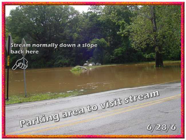Oops - this is out of sequence. It should have been after the second pic of the bridge. This is the parking area for visting the stream - this is about 1/2 mile or less from my house. Normally the stream would be down a small hill and just to the left in the picture (if you could even see it at this angle under normal conditions. The water is about 1ft deep through this area - now it is about 7-8! |