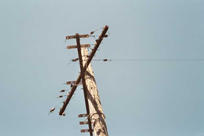 This pole is on the west end of a stretch of open wire along the railroad. More details of the line are in Stairway to Open Wire posted in the General catagory. The Johnny Ball strain insulator method of wire dead ending is perhaps the second oldest method, the first being double insulators on pins. You will see very little of this type of dead ending anywhere and this will be gone someday too! |