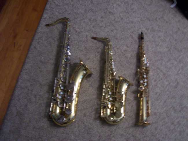 I have always loved saxophones. I started playing them about 3 years ago. From left to right is a tener sax, then alto sax, and finally a soprano sax(my favorite!). I am still missing the baritone sax, which is about 3x the biggest sax in this picture( and 3x the cost!!!). Enjoy! |
