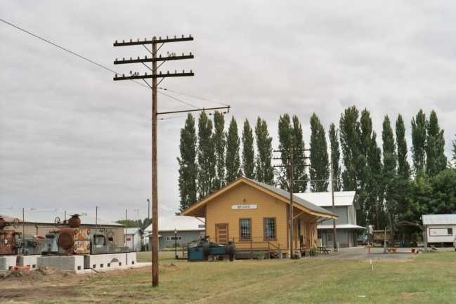 Three crossarms with insulators have been installed recently for display at the restored Brooks, OR. depot by the Line Dept. of the Oregon Electric Railway Museum (that's me and my partner Greg Bonn). Last year we put up one pole of triple 10 pin arms near the depot. By adding crossarms on this pole shown, it gives the impression that the line is going somewhere and not just 1 pole with insulators, as you can see in the following photos. Thanks go to Salem, OR. collector Nathan Lamkey for coming up with some great color choices to add to my color choices. |