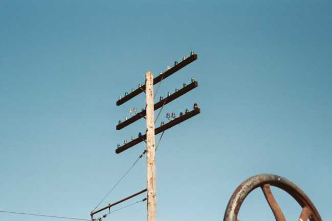 This photo should be close enough to zoom in and see what's up there. We wanted to display a couple of the same type transposition brackets that were used on the real open wire line that went by the Brooks Depot. That line is still standing and located less than a mile away from this spot. UPDATE ! as of 2008, the original railroad open wire line has been totally removed :-/ |