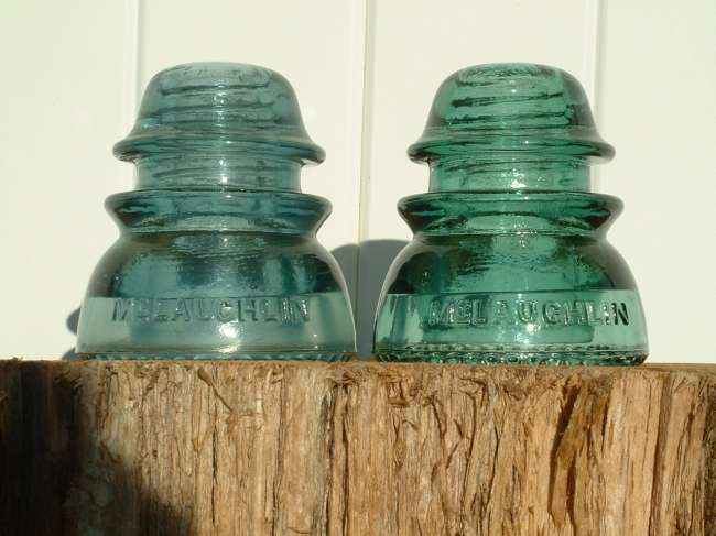 Two McLaughlin CD 154's with two colors that I can't identify without something to compare them to. Both have {NO 42} embossed on the rear skirt which is unlisted. Both also have round drip points. The Guide offers light green, lime green, sage green, blue gray, dark steel blue, and delft blue (what the heck is a delft?) in the nearest [050] and [055] embossing. Bob McLaughlin set me straight - the one on the right is definitely sage green while the one on the left is sage blue. This is largely determined by style (short), drip points (Close Large Round - CLRDP) and the embossing. Fred Padgett's Book 'Dreams of Glass' is a great resource when trying to classify McLaughlins if you don't have Bob there to help you! |