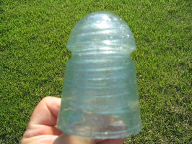 I picked up this little guy at a flea market last weekend for a $1. It was so black with soot that I walked by it one time thinking that it was one of the rubber insulators. It took a while to clean up and boy was I surprised when this color appeared. I am calling it an ice aqua. I have never seen a Pennycuick this light before. It's about mint and is so full of bubbles that it sparkles in the sun. Out of the sun it looks almost jade. |