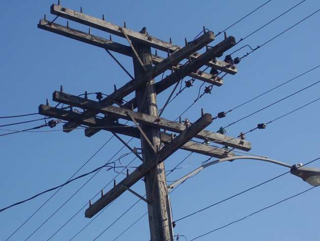 Full view of the pole shown in the last picture. This is still following the same line south, and shows a tap going east.