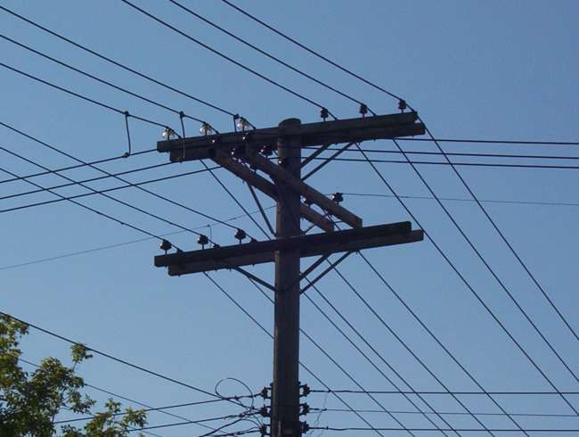 This is continuing north on the street I initally started walking down about 4 spans from where the 24 KV continued west. Not to sure how the top west circuit (one with glass) is fed as it doesn't follow the 24 KV west as underbuild (see 2nd pic after this). It seems to just end about 5 spans south near the 24 KV corner. At the 24 KV corner, only the top east and the bottom circuits are the two that follow the 24 KV west along with the other two circuits coming from the south. This is as far north as I went before going back once again to the 24 KV corner. Next Picture: [id=160594206] |