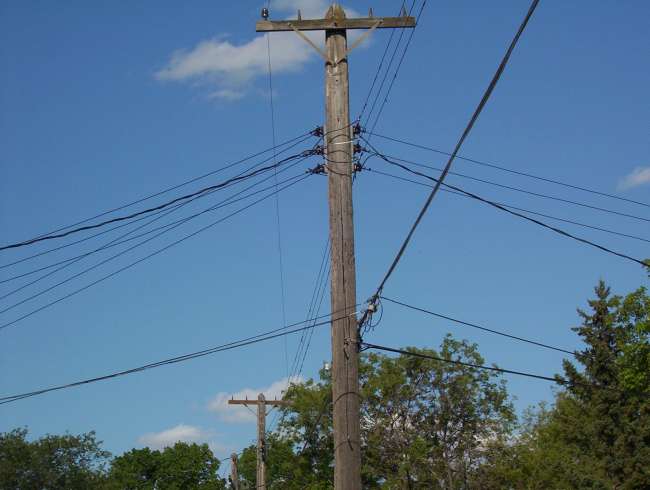 The last 3 poles looking east on this tap from the last pole with the square transformer (the third pole is a dead end/transformer pole). Thought it was interesting how they made the line zig-zag here for no apparent reason. This was as far east as I went before going back to the 24 KV corner and going north a ways. Notice the large number of open-wire services in this area. Next Picture: [id=160594262] |