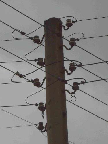 Here's a 230 V concrte pole with porcelain insulator. This are the common low voltage insultor use in the former German Democratic Republic (GDR). In the GDR, overhead powerlines are common, after the reunion with the Federal Republic of Germany, much of the old infrastructure are modernised (and the old overhead powerlines are replaced by earth wires or insulated overhead power cabels). |