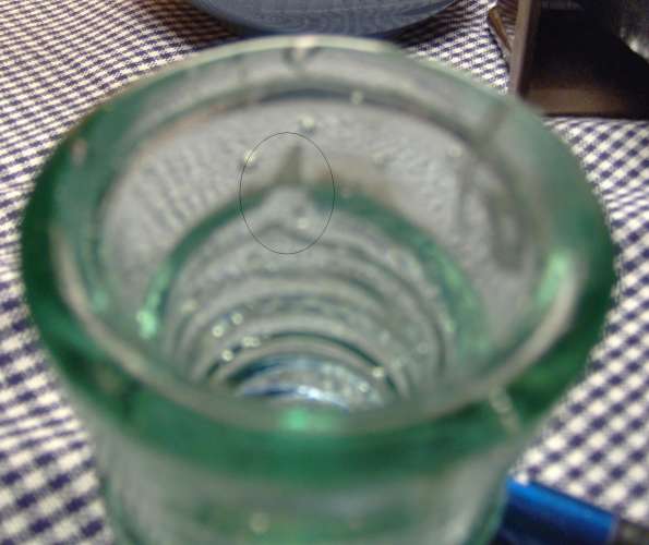 This insulator is a CD 102 Diamond with a defect in the beggining of the threads. It appears it touched something when the glass was still hot, and it stretched the threads out. It is like a VERY sharp drip. I tried to get the best picture of it that I could get, it is circled in the picture. I got this insulator from Timmothy Baggett when I bought twenty wooden pins. He was nice enough to include 6 insulators for my beginning collection. Thanks again! |