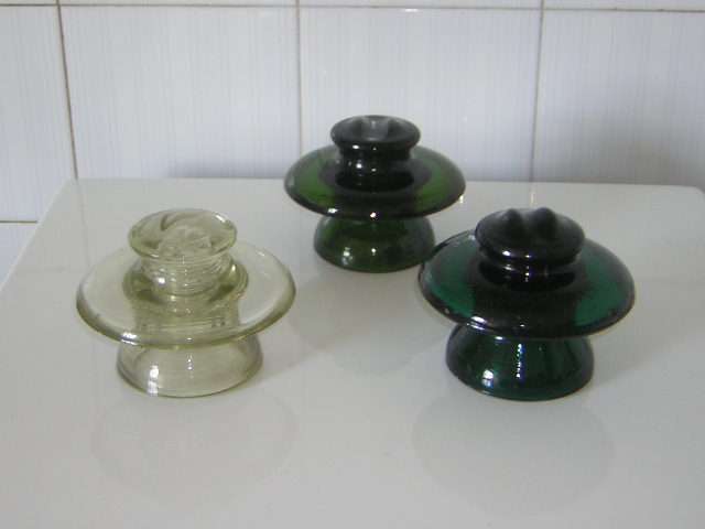 Here are shown, left to right, the MIVA 1205 CA in light glass, the same insulator in green, and the 1205 UNES in green color