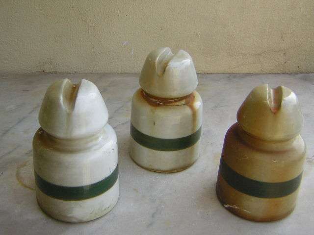 Three insulators type 1/1920 with high green stripe, here on my balcony in Tuscany, before the wash.......... thanx to my friend Aldo who rescued them.