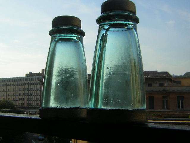 Here are, at the light of the sun, the two aqua glass indoor I got yesterday. This type is very rare in glass. On the right one, you can read the factory embossing MIVA
