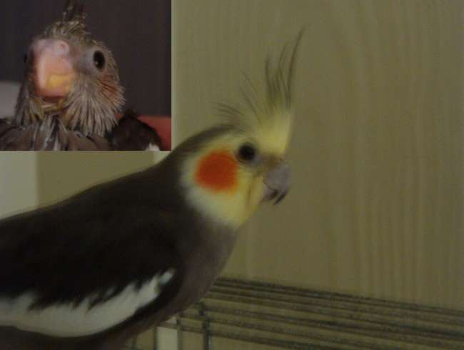 We used to breed cockatiels for a little bit, and this picture shows a young cockatiel, about two weeks oldand what he looks like now. They really come out ugly, don't they? After a while, though, they are pretty cool.
