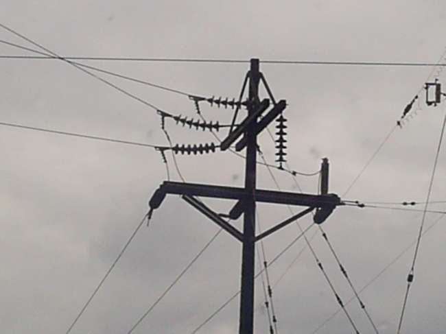 another view of the pole that 'ducks' the outgoing 115kv tap line. note how the discs are turned around because of the upward angle of the lines. also note the singlephase 7200 kv line next to it.