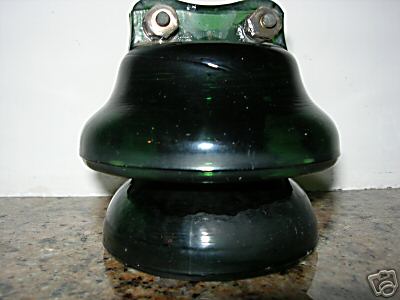 Just snagged this one from E-bay, from a seller in Italy, a new CD green glass "spook" (or perhaps it looks more like a frog) insulator. I'll post a better photo when it arrives. This photo is from the seller. Update, Nov 27, 2006: This one arrived on Saturday Nov 25th. It is about the size of a CD 154, and I discovered something very interesting: This is a two part insulator, the two sections screw together, and it has a "dry spot" area between the two sections, and there are three holes for wire access between the lower and upper sections. The pinhole is not threaded. So, would this qualify as a true "threadless" insulator? More photos to follow. I know of only two or three more of these here in the USA. No CD number has been assigned, nor does it have any identifying markings. Most likely manufacturers would be Miva, Borgo or Fidenza. The dark green glass was used in the 1920s and 1930s. It's function is a fuse holder, the fusible wire connects between the two "eyes" and teh wiring to/from the fuse is fed up under teh skirt of the top section, and spliced in under the "dry spot" space inside. I've now seen one of these in clear glass, as well, no identifying markings at all. Update 1/10/2009: I have just been informed that this insulator has been assigned the number CD 698. |