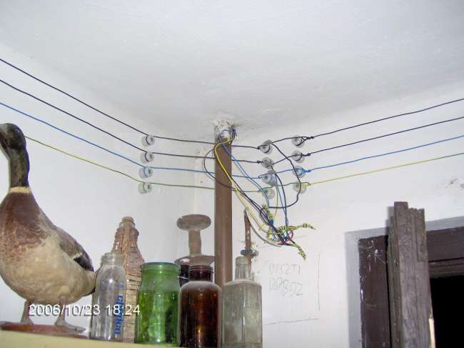I have done my weekend house's electricity system in the first indoor technology from the filrs electrifies.. Here is the supply point.. when I will have more money, here will be a fuse box. The Insulators are from plastic, I ordered 400 pieces from a turner from a porcelain spool mint, the wires are from 1.5 mm2 (square-milli-metres) copper: black: hot wire (phase), blue: null wire and the yellow-green: earth protector |