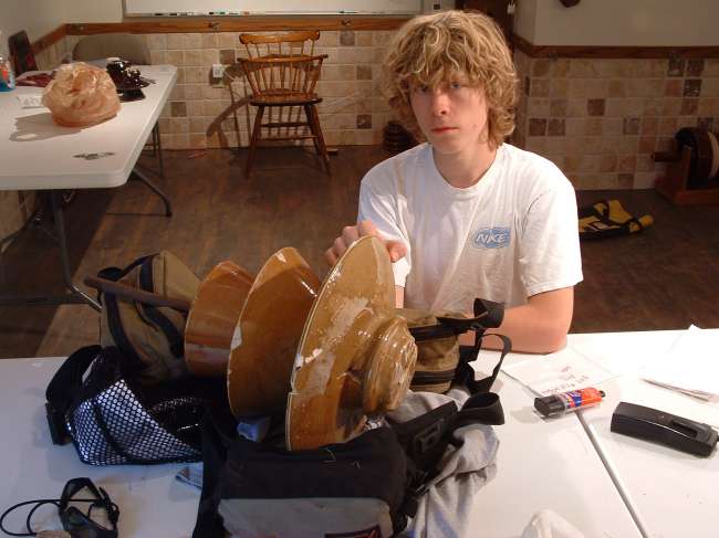 Insulator repair day at the Thorne house. Coolector Keith Thorne, working on rpairs to a rare New lexington 4325A. Original pin is still in place from this old Borel power line from 1904. Also broken M-4422 repair [169081526]