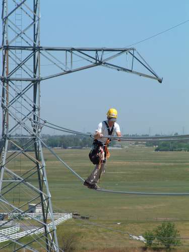 Here Scott Bye of Ropes That Rescue walks the tri-bundle conductor of WAPA 500kv in Sacramento Metro Utility District trainig course in 2006.