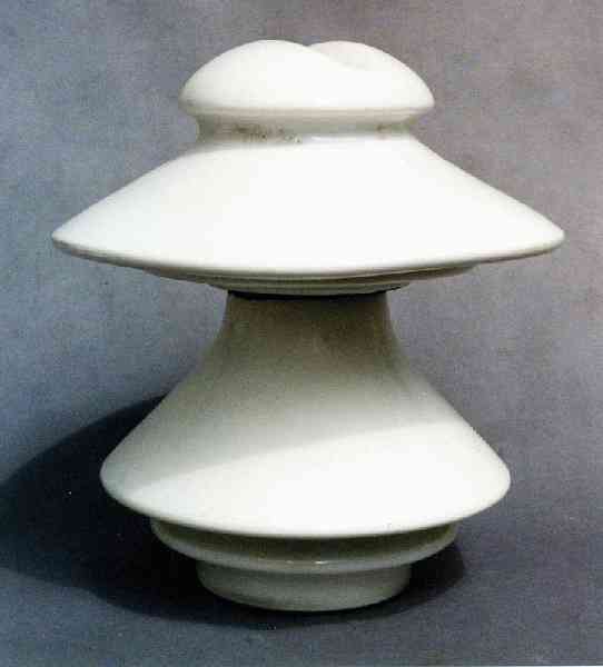A classical Italian power insulator, the type "Paderno", that was developed for the 13,5 kV 30 miles long line from Paderno to Milano, built 1898. This one is a later two parts specimen, but it is quite old and depicts well the unique shape of the Paderno style. [IFONA M] |
