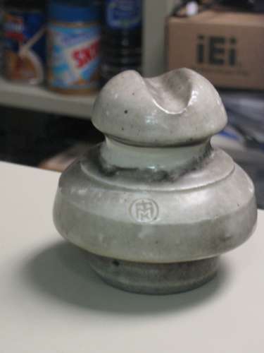 A small (80 mm / 3.125 inch) diameter porcelain insulator from Russia, incused with the letters TMK., inside of a circle. This is the same size and similar shape to various CD 472 "N80" insulators. This matches up closest to either U-2254 or U-2257. This one just arrived, so here is a new side view photo, showing the marking. Actual color is "oatmeal" white, under all that soot. The surface has lots of little "zits" (rough spots) and brown "freckles" baked into the glaze. After a couple of days soaking in Oxalic acid and some mild scrubbing, it is looking a lot better. This insulator may possibly be of German origin, but it was found on Russian soil. |