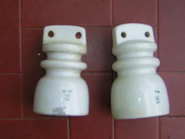 a couple of VACCARI CN 142 porcelain spooks, dating 1950s: once rather common, but unusual insulators, in the XXI century. They were used fot the series connection of the public lamps.