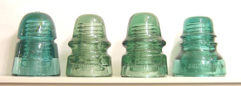 Left to Right: 1. Hemingray aqua 2. California typical sage green: grey-green and overall muted. Has a silvery or gray cast like the leaf of the same-named plant. 3. California in plain green. 4. Brookfield aqua