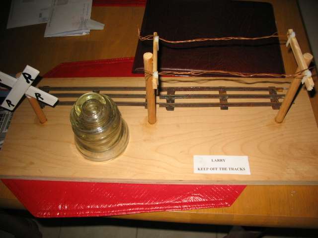 Another view of the little "trophy" presented to me. The little card says, "LARRY, STAY OFF THE TRACKS" See third pic for card.