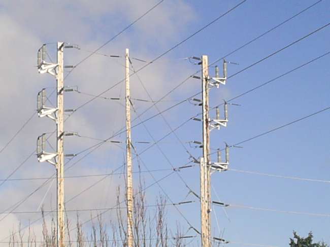 A little closer view. Note how the switch on the right is in the open position. also note the pole that takes the output from the switch and splits it, the left going to the sub right by the line and the right continuing on to the sub down the road.