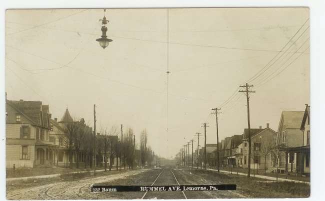 Street Scene circa 1895-1900 showing an enclosed style arc light with a cool looking pole line on each side of the roadway extending into the horizion. Location is along Hummel Avenue in Lemovne, Pennsylvania.