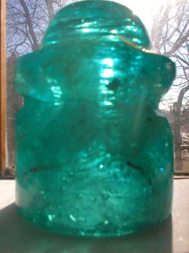 This piece was located in Mexico about 12 years ago and is among a variety of Chicago Diamond's of this style that have varying degrees of wild bubbles, swirls and other inclusions in the glass. This example is lettered on its shoulder. Update 2-6-07: I have just listed three better photos of this piece including a couple base views. Thank you. |