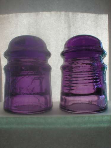 Both the marked and unmarked C.E.W. ponies in purple are shown here. The embossed one is on the left and only a handful of these exist.