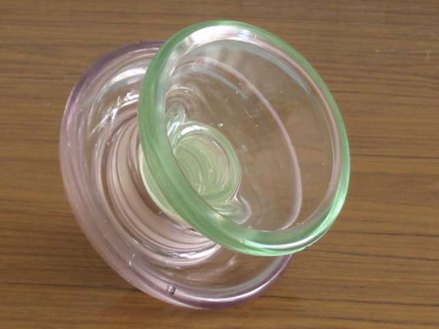 An insulator collector in Italy sent me these photos of a Fidenza 6205 2 part insulator, about the same size of a Pyrex CD 320, that he has. This is unusual in that the top part is a light purple and the bottom section is light aqua. Most of these 6205s are "ice" or clear color. This one is probably a CD 381, I'll check in my GIFONA and see what CD is assigned to a 6205. I just got a photo of this one, still on the pin, before it was ckleaned up, so it is original this way.. This is very similar in size and profile to a Fidenza 2205 (Dark Green) and CA2205A (light aqua), but the top section is of a little heavier construction |