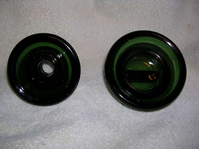 Bottom views of teh two sections of this insulator. The pinhold in the lower section has no threading or ridges. So, I suppose it could be called a threadless, green frog, spook, two-part, dry spot, terminal insulator. About as common as turtle fur or chicken lips ;-) Nora Coppo has posted a couple of photos of this type insulator earlier, as well as a couple of these in clear glass. [id=155905150] The mystery has been solved, this is now a CD 698 and its function was as a fuse holder (portafusible in Italian). These wer emade by MIVA and possibly Fidenza. The fuse link was a strand or two of thin wire connected between the two "eyes". |