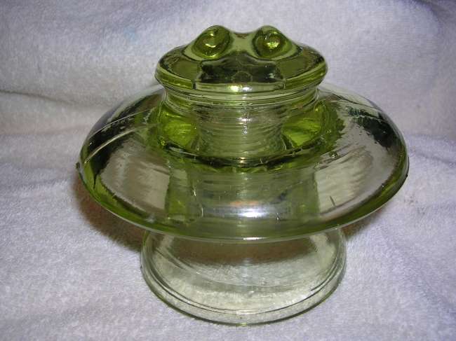 Very faintly embossed, CD 320.5, MIVA, UNES 1205 (1 part, 2 skirts / shells, 5KV rating) insulator in a light citrine / yellow green. Nearly same dimensions as a Pyrex CD 320. This one has lots of "straw marks" on the outside. The embossing MIVA // 1205 is very weak, on the top, either side of the top cable groove. I now have a MIVA UNES 1205 CA, in blue aqua color, which is coming to me. First one of this color that I have seen. To see this one, [id=183370506] |