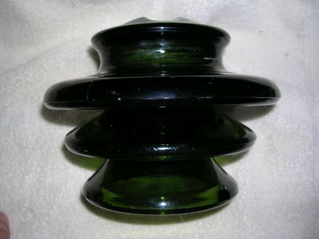 A closer look at this mid-sized, three part, 18KV rated power insulator in dark green, unlisted in GIFONA. The CA designation indicates a wider top cable groove to accomodate larger diameter aluminum wire. (Whoops, I got my mivas and fidenzas confused ;-) Probably a CD 376.X, it is not listed in GIFONA, it measures between the CD 376 and CD 377 dimensu\ional specifications. This one is slightly larger than a CD 376 (Miva M-315-CA or Fidenza 6315, but not as large as a CD 377 These apparently were marked with A 318 CA and with M 318 CA, IIRC, the "A "designation mens "Alto" or High Vooltage, "M" is for Medium Voltage, and "B" as in BT2CA is for "Basso" or Low Voltage. So the 318 (3 shells, 18KV) may have been consideredas Medium Voltage at one time, and then Alto / High Voltage at a later time. The dimensions are top skirt: 6 7/8 inch diameter; middle skirt, 5 7/8 diameter; base diameter 4 4/3 inches; and overall height 5 1/2 inches. This matches CD 376 and its derivitavescloser thaneither CD 375 (M 312 CA or 6310) or CD 377 (A 320 CA). As far as I know there is no GIFONA listed CD for the A 318 CA. |