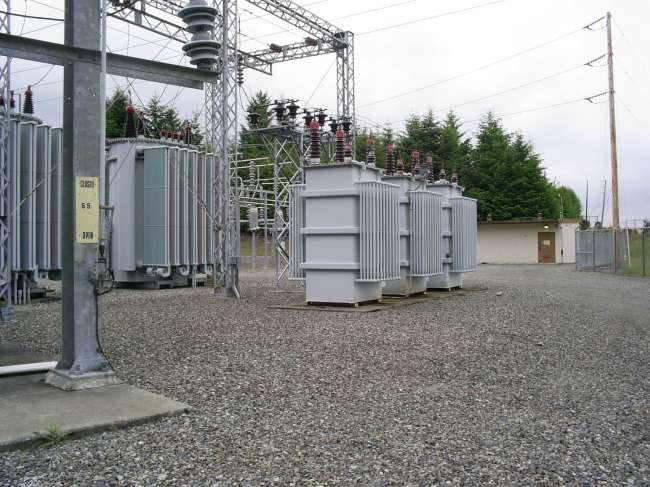 This is the 115 kv to 55 Kv substation on the hill above the Electron Hydro plant. There's a 115kv line that comes in from the Frederickson generating plant a few miles away, an outgoing 115kv line to the Blaumer substation near tono via Yelm, a 115 kv line from the White River substation via Orting, and a 55kv line to Krain Corner via Wilkeson and Buckley. The incoming feed from the powerhouse is 115kv. Shown here: on the left the step-down transformers and regulators for the 55kv.  |