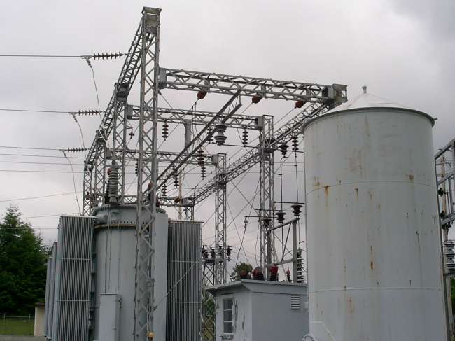 115kv feed to the 55kv step down bank. I think the cylinerical thing on the right has extra transformer oil in it(?).