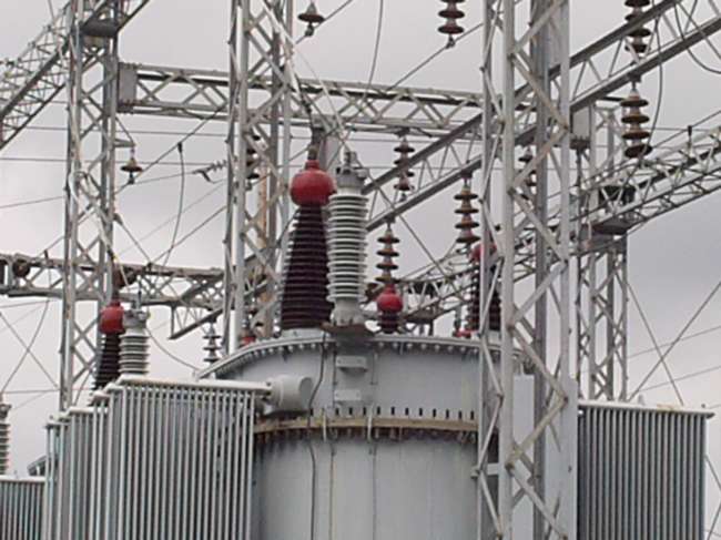 Close up of one of the transformers. Note the line insulated by single discs. Ground wire ? There's a drop to each transformer.