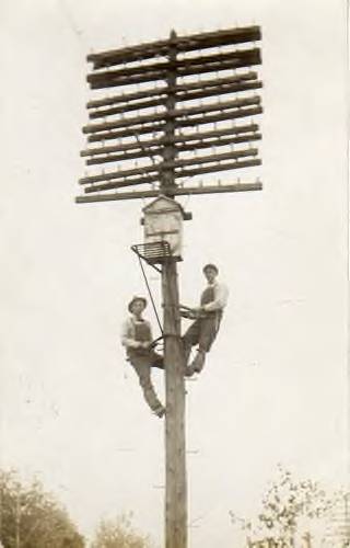 When all of those single open-wires of the days of 'yore came "to an end" (physically) it is my knowledge that they were often terminated on the line wire as dead-ends on double-mounted or "buck" crossarms. From there an insulated wire led to a weather-protected wooden junction box (see photo) whereby further connections could be made to customers, switchboards as well as underground conduits, enclosed twisted cable pairs, etc. |