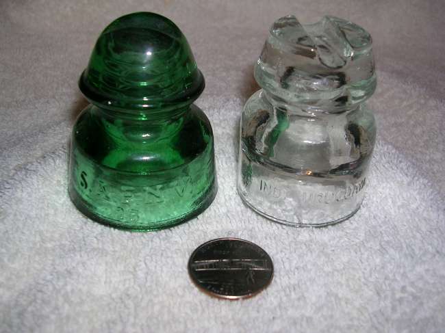 These are about the smallest glass pintupes insulators I've ever seen (along with the CD 528). The clear one is a CD 510, The green one is a CD 500. Compare to the size of a quarter.