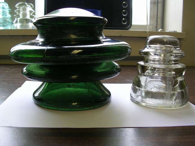 This is another, somewhat lighter green MIVA A 318 CA. Compare in size to a normal CD 155 for size reference. This is a three-part glass insulator, cemented together, markings on top surface, and CA designates a wider top groove for larger gauge aluminum wire. Not yet cleaned up, but it still looks great! Voltage rating is 18 Kilovolts. A Miva A-320-CA (20KV, 3 part) is listed as CD 377.2, this one is just slightly smaller. This one is slightly larger than a CD 376 (Miva M-315-CA or Fidenza 6315, but not as large as a CD 377 These apparently were marked with A 318 CA and M 318 CA, M refers to "Medium Voltage" and A to "Alto" or High Voltage, different times, different electrical standards and definitions apply. FWIW, B as in BT2CA would mean "Basso" or Low Voltage. The dimensions are top skirt: 6 7/8 inch diameter; middle skirt, 5 7/8 diameter; base diameter 4 4/3 inches; and overall height 5 1/2 inches. This matches CD 376 and its derivatives closer than either CD 375 (M 312 CA or 6310) or CD 377 (A 320 CA). As far as I know there is no listed CD for the A 318 CA. |