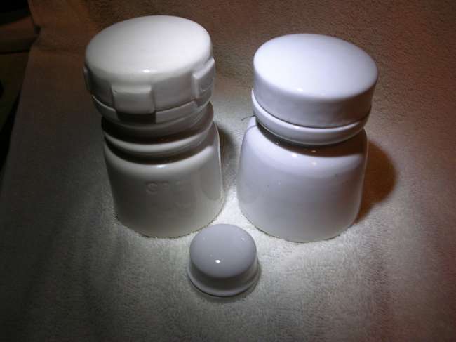 On the left, a GPO terminal "screwtop" insulator from the UK, looks to have never been used. On the right, a Langenthal from Switzerland, this one has definitely served active duty. In front, a small low voltage & current terminal block from Italy.