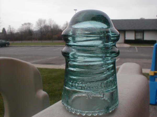 This is one of those early script pieces that is one of the more rare and desireable CD 106 insulators. This insulator is embossed (FS)HEMINGRAY No 9 {No line under "O"}(RS)PATENT MAY 2 1893.The embossing is the early script embossing, they had used a SB mould and added the patent date and the drip point baseplate. These were made about 1894-95'.Note the grey/blue colour. Tough! |