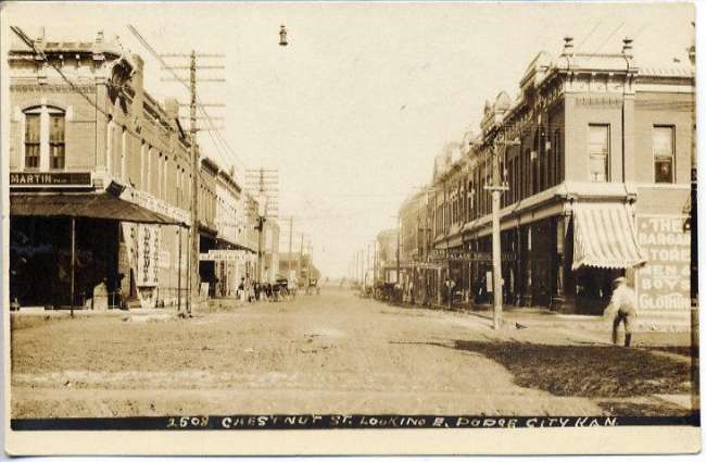 Believed to be somewhere in Kansas probably soon after the turn of the century. One can only imagine the brilliant and colorful insulators that might have graced the pole lines on *each* side of this town's streets! Especially knowing that the majority of early Hemingray "specially colored" insulators such as vivid blues and ambers have been found in that state! |