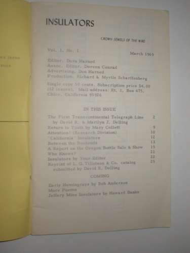 This is a look at the masthead and table of contents for Volume 1, Number 1 of Crown Jewels of the Wire magazine.... SEE FOLLOWING PHOTO AND DESCRIPTIONS AS WELL... Yes, the image is kinda fuzzy in places so here are the details: Topics listed were: "The First Transcontinental Telegraph Line" by David R. and Marilyn J. Delling; "Return to Youth" by Mary Collett; "Attention!" (Research Division); "California Insulators"; "Between the Bookends"; "A Report on the Oregon Bottle Sale and Show"; "Who Knows?"; "Insulators by Your Editor" and... "Reprint of L.G. Tillotson & Co. catalog" submitted by David R. Delling COMING: "Early Hemingrays" by Bob Anderson; "More Poems" and... "Jeffrey Mine Insulators" by Howard Banks ++++++++++++++++++++++++++++++++++++++++++++++++++++++++++++++++ |