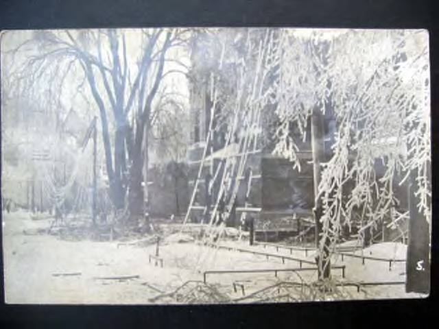 Circa 1905. The awesome weight and subsequent brutal force of gravity upon these heavily loaded tree branches and utility wires broke nearly every tree and pole in this community during this heavy ice storm. One can only imagine the many, many hours (and days!) of hard labor it took to clear the streets and in rebuilding the utility lines! And that was in the days *before* chain saws and most other portable debris-cleaning/removing equipment were commonplace...to boot! |