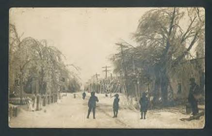View from a street in a community near Montreal depicting the devestation to the overhead wires, poles and trees. The result of the aftermath of a heavy ice and sleet storm.